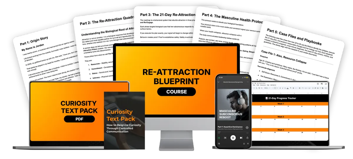 The 21-Day Re-Attraction System™ is a complete, step-by-step process that rebuilds attraction at the biological root. It shows you exactly how to reset her instinctive desire for you through masculine psychology, behavioral rewiring, and emotional control. Every day is laid out clearly so you know what to do, what to avoid, and when to re-engage.